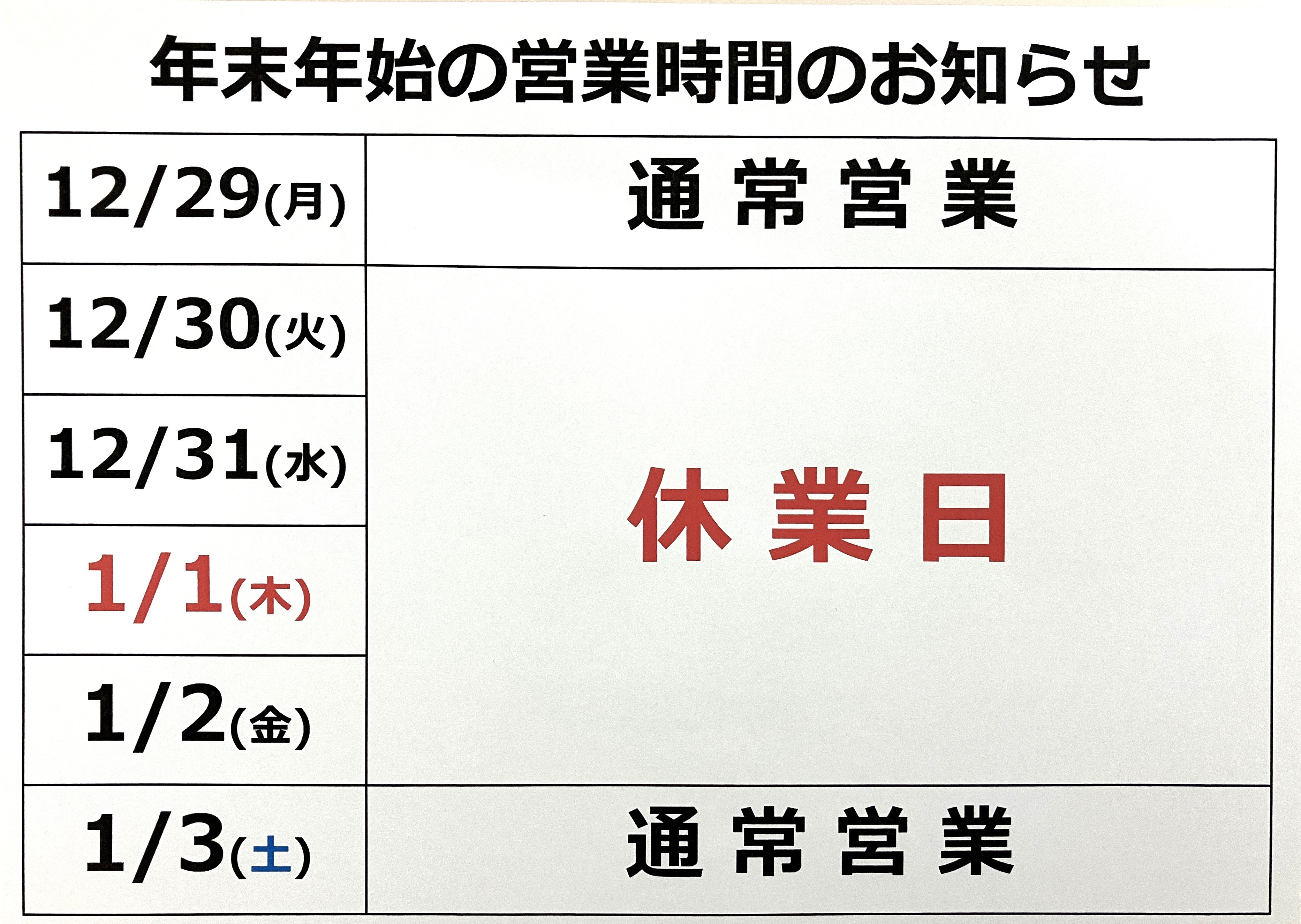 | 2024/12/22 年末年始営業案内 年内30(月)まで通常営業(9:30〜18:30)です。 |